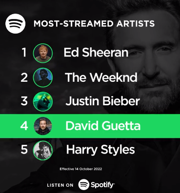 In breve: David Guetta è il 4° artista più ascoltato su Spotify. Siede accanto a nomi del mondo Pop come Ed Sheeran, The Weeknd e Justin Bieber. Inseguito da Harry Styles, continua a macinare milioni di streams e rimane sulla cresta dell’onda.