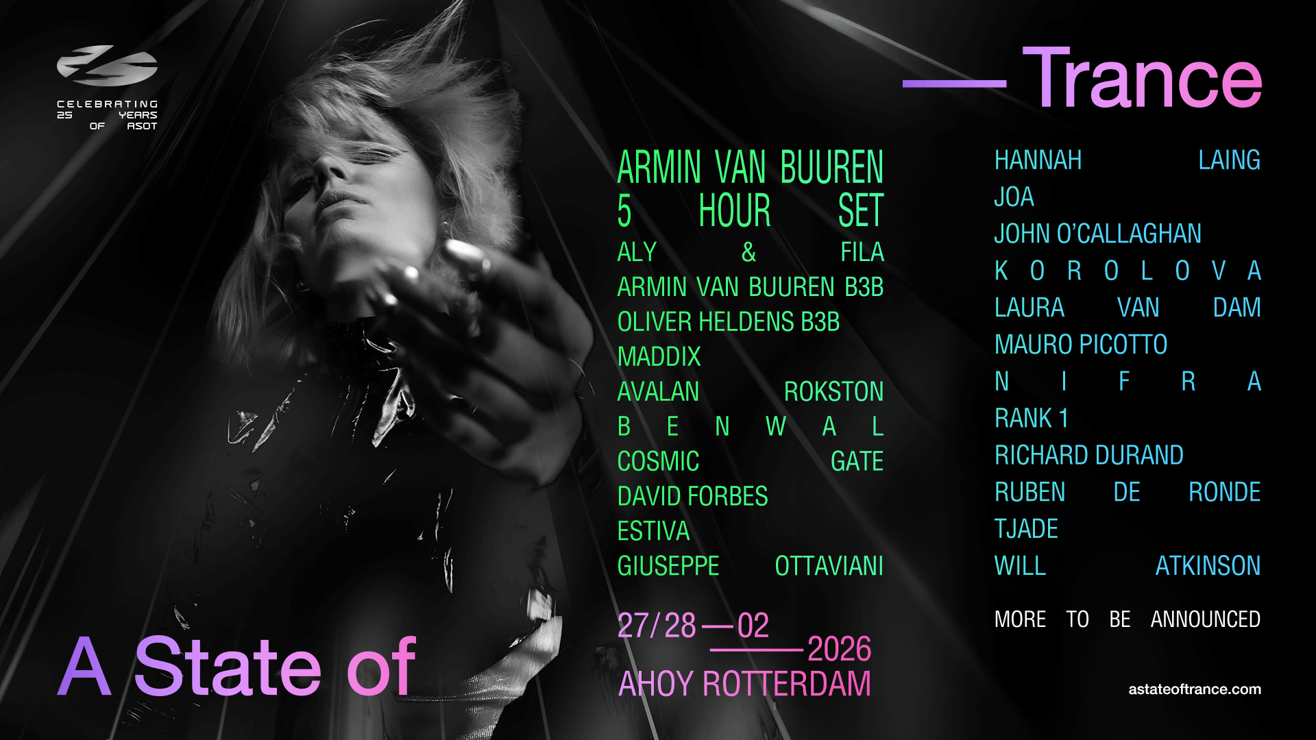 The anniversary of the legendary trance music festival, curated by Armin van Buuren, will return to Rotterdam Ahoy on February 27-28, 2026 for an extraordinary edition that will once again write music history. The first names of the lineup have already been announced, including Oliver Heldens, Maddix and of course Armin van Buuren in an exclusive “back-to-back-to-back” set, probably similar to the Face2Face concept we saw this year in Ibiza. Also on the lineup: Cosmic Gate, Benwal, Tjade, Estiva, Giuseppe Ottaviani, Korolova, Laura van Dam and Mauro Picotto. The event will close with Armin van Buuren’s exclusive five-hour performance revisiting the highlights of 25 years of A State of Trance.