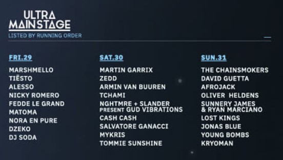 Già dalla Phase1 possiamo affermare che la 21esima edizione sarà quella dei “Grandi Ritorni”: spiccano subito i nomi di Alesso, Martin Garrix, DeadMau5 (che proporrà la versione 3.0 del suo QUBE), Zedd e Galantis. Ma sarà anche un’edizione di grandi novità, oltre quella della location, troviamo infatti nuovi artisti tra cui ILLENIUM. Ultra ha inoltre annunciato che i djset saranno più lunghi non avendo più le limitazioni degli orari impostati dalla città e gli spazi molto più aperti per accogliere molti più fan da tutto il mondo.