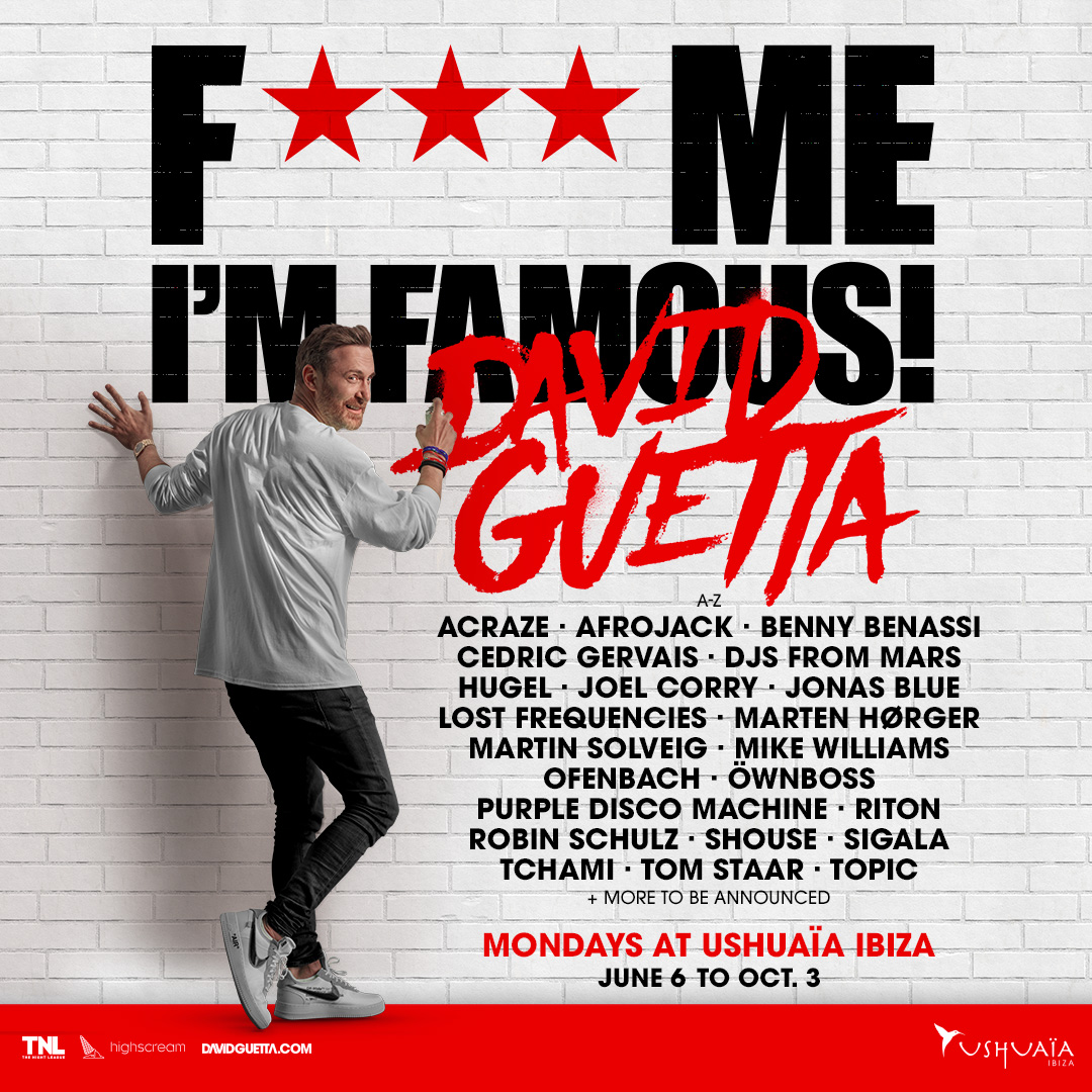 F*** ME I’M FAMOUS! 2022 è, a tutti gli effetti, un’istituzione di Ibiza. L’evento, sempre molto popolare, vede il pioniere della musica dance David addentrarsi nel suo sound unico, composto da Future Rave e Progressive House.